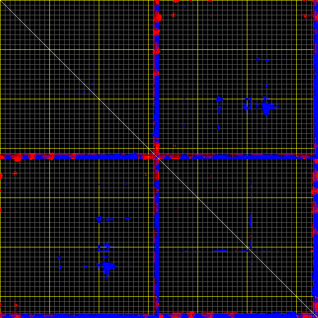 This matrix displays the maximum distance fluctuations between all pairs of CA atoms and between the two extreme conformations that were computed for this mode (DQMIN/DQMAX). Distance increases are plotted in blue and decreases in red for the strongest 10% of the residue pair distance changes. Every pixel corresponds to a single residue. Grey lines are drawn every 10 residues, yellow lines every 100 residues (counting from the upper left corner).