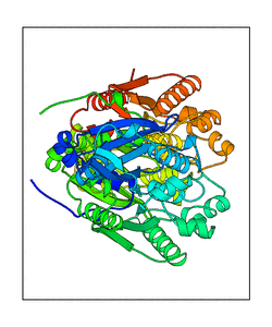 These views are prepared from three orthologuous viewpoints with MolScript. Secondary structures are determined from the C-alpha atom positions of your protein (N-terminal blue, C-terminal red).