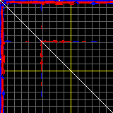 This matrix displays the maximum distance fluctuations between all pairs of CA atoms and between the two extreme conformations that were computed for this mode (DQMIN/DQMAX). Distance increases are plotted in blue and decreases in red for the strongest 10% of the residue pair distance changes. Every pixel corresponds to a single residue. Grey lines are drawn every 10 residues, yellow lines every 100 residues (counting from the upper left corner).