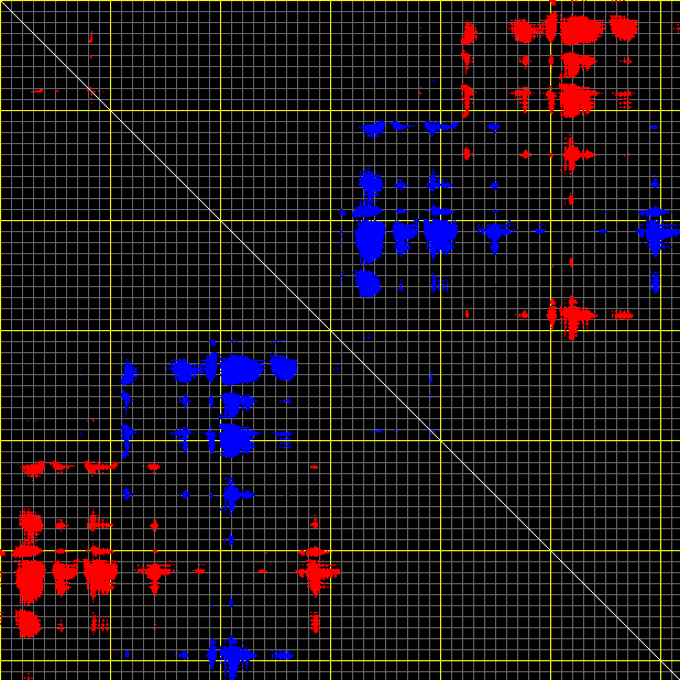 This matrix displays the maximum distance fluctuations between all pairs of CA atoms and between the two extreme conformations that were computed for this mode (DQMIN/DQMAX). Distance increases are plotted in blue and decreases in red for the strongest 10% of the residue pair distance changes. Every pixel corresponds to a single residue. Grey lines are drawn every 10 residues, yellow lines every 100 residues (counting from the upper left corner).