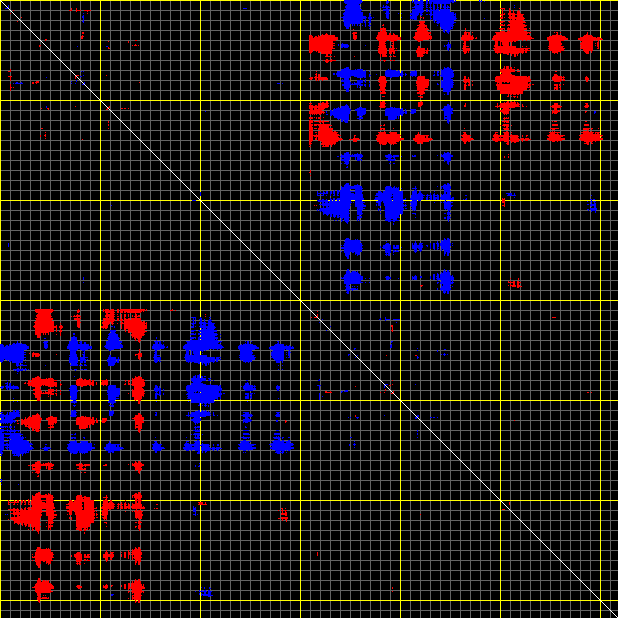 This matrix displays the maximum distance fluctuations between all pairs of CA atoms and between the two extreme conformations that were computed for this mode (DQMIN/DQMAX). Distance increases are plotted in blue and decreases in red for the strongest 10% of the residue pair distance changes. Every pixel corresponds to a single residue. Grey lines are drawn every 10 residues, yellow lines every 100 residues (counting from the upper left corner).