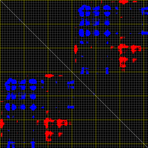This matrix displays the maximum distance fluctuations between all pairs of CA atoms and between the two extreme conformations that were computed for this mode (DQMIN/DQMAX). Distance increases are plotted in blue and decreases in red for the strongest 10% of the residue pair distance changes. Every pixel corresponds to a single residue. Grey lines are drawn every 10 residues, yellow lines every 100 residues (counting from the upper left corner).