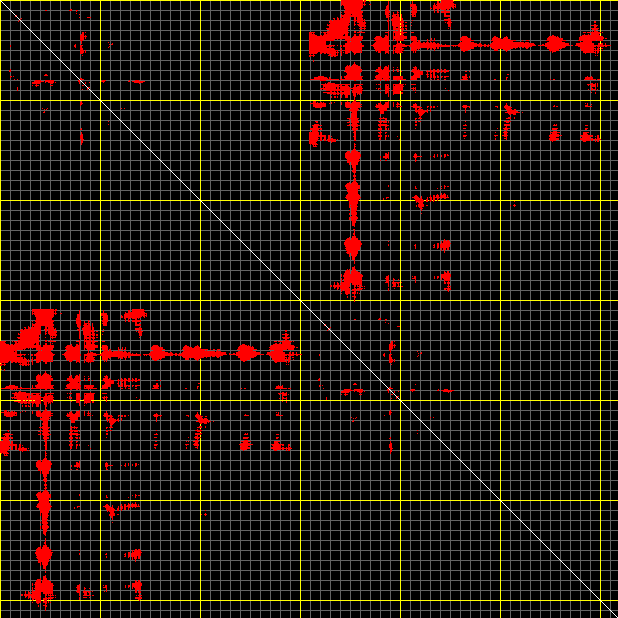 This matrix displays the maximum distance fluctuations between all pairs of CA atoms and between the two extreme conformations that were computed for this mode (DQMIN/DQMAX). Distance increases are plotted in blue and decreases in red for the strongest 10% of the residue pair distance changes. Every pixel corresponds to a single residue. Grey lines are drawn every 10 residues, yellow lines every 100 residues (counting from the upper left corner).