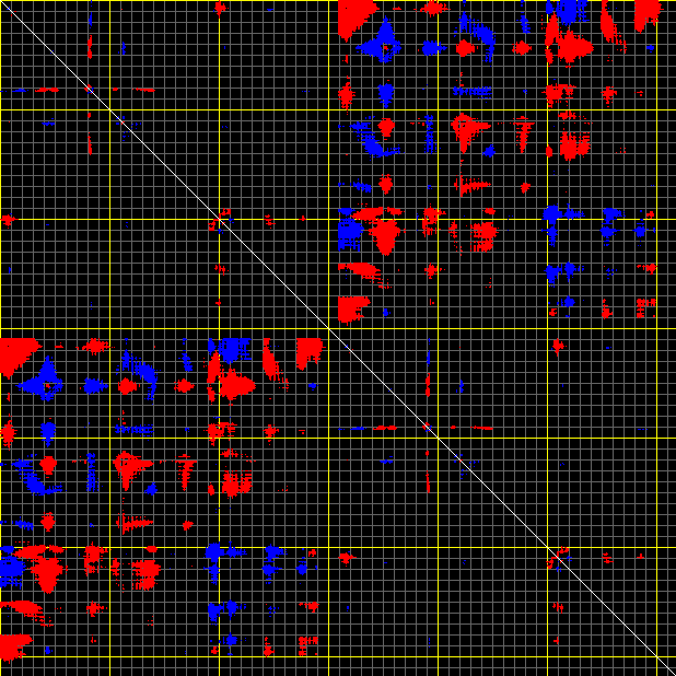 This matrix displays the maximum distance fluctuations between all pairs of CA atoms and between the two extreme conformations that were computed for this mode (DQMIN/DQMAX). Distance increases are plotted in blue and decreases in red for the strongest 10% of the residue pair distance changes. Every pixel corresponds to a single residue. Grey lines are drawn every 10 residues, yellow lines every 100 residues (counting from the upper left corner).
