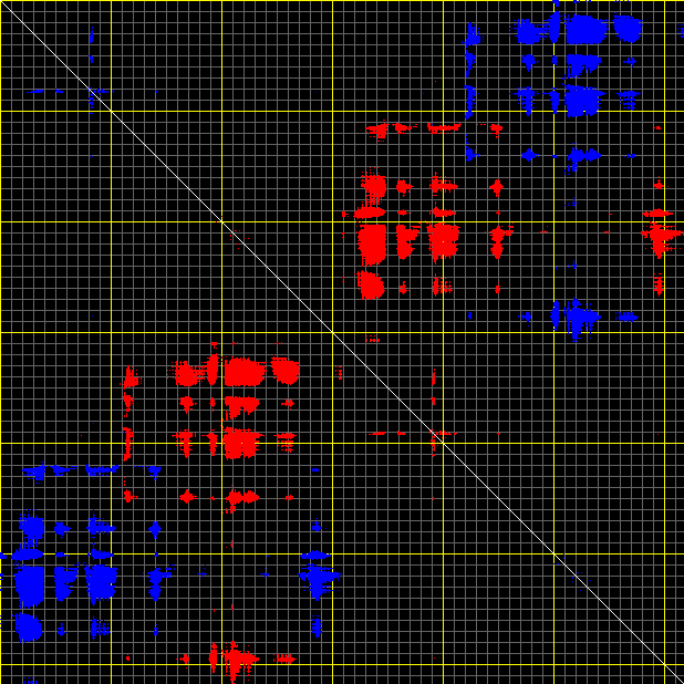 This matrix displays the maximum distance fluctuations between all pairs of CA atoms and between the two extreme conformations that were computed for this mode (DQMIN/DQMAX). Distance increases are plotted in blue and decreases in red for the strongest 10% of the residue pair distance changes. Every pixel corresponds to a single residue. Grey lines are drawn every 10 residues, yellow lines every 100 residues (counting from the upper left corner).