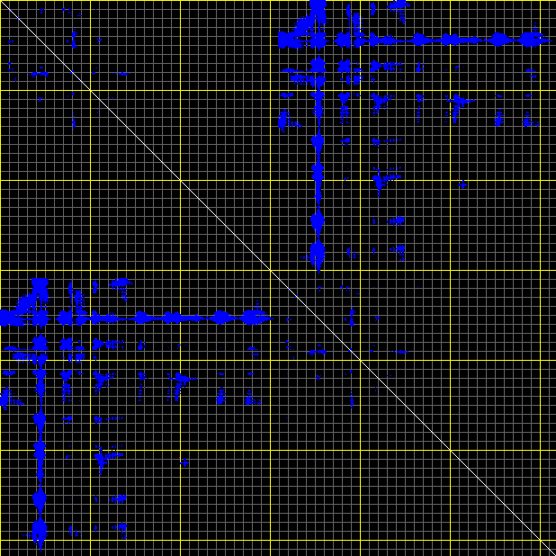 This matrix displays the maximum distance fluctuations between all pairs of CA atoms and between the two extreme conformations that were computed for this mode (DQMIN/DQMAX). Distance increases are plotted in blue and decreases in red for the strongest 10% of the residue pair distance changes. Every pixel corresponds to a single residue. Grey lines are drawn every 10 residues, yellow lines every 100 residues (counting from the upper left corner).