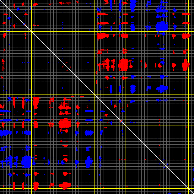 This matrix displays the maximum distance fluctuations between all pairs of CA atoms and between the two extreme conformations that were computed for this mode (DQMIN/DQMAX). Distance increases are plotted in blue and decreases in red for the strongest 10% of the residue pair distance changes. Every pixel corresponds to a single residue. Grey lines are drawn every 10 residues, yellow lines every 100 residues (counting from the upper left corner).