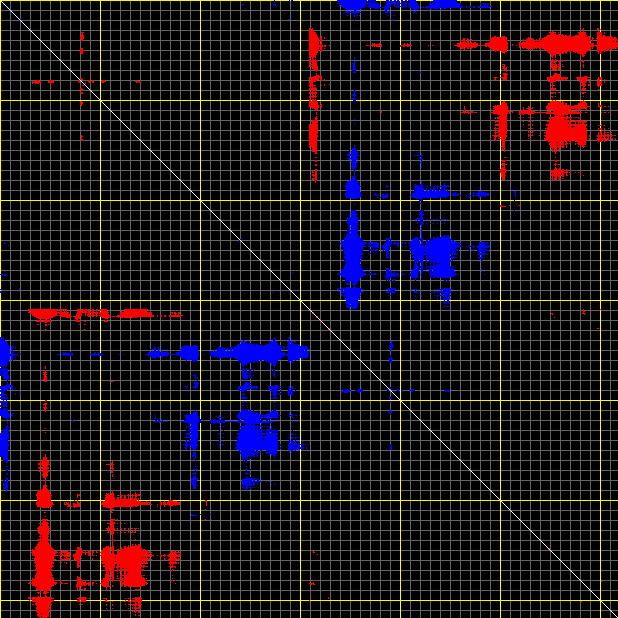 This matrix displays the maximum distance fluctuations between all pairs of CA atoms and between the two extreme conformations that were computed for this mode (DQMIN/DQMAX). Distance increases are plotted in blue and decreases in red for the strongest 10% of the residue pair distance changes. Every pixel corresponds to a single residue. Grey lines are drawn every 10 residues, yellow lines every 100 residues (counting from the upper left corner).