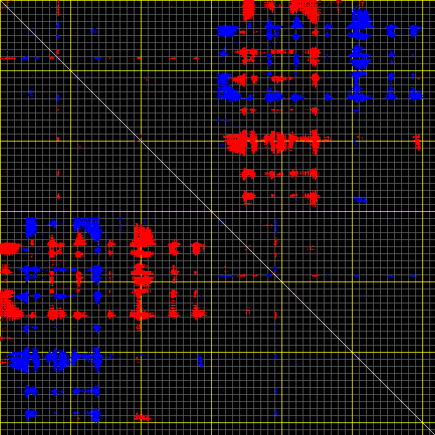 This matrix displays the maximum distance fluctuations between all pairs of CA atoms and between the two extreme conformations that were computed for this mode (DQMIN/DQMAX). Distance increases are plotted in blue and decreases in red for the strongest 10% of the residue pair distance changes. Every pixel corresponds to a single residue. Grey lines are drawn every 10 residues, yellow lines every 100 residues (counting from the upper left corner).