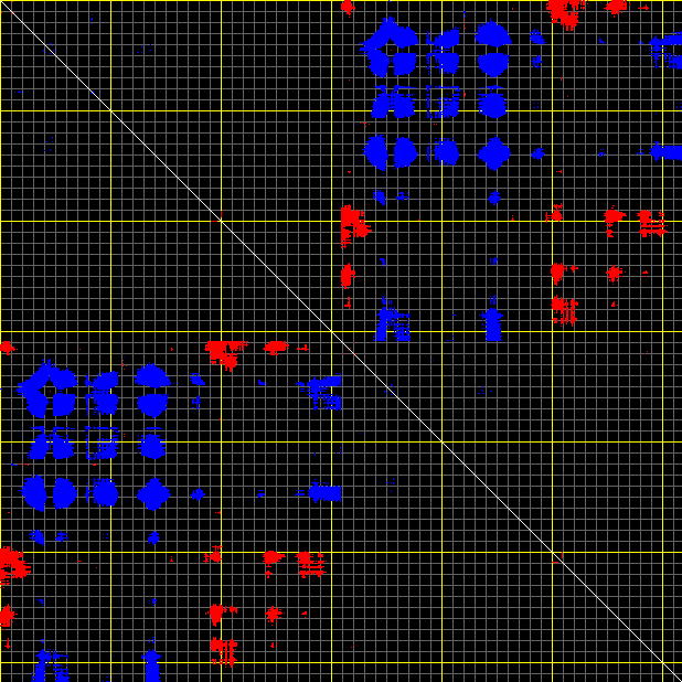 This matrix displays the maximum distance fluctuations between all pairs of CA atoms and between the two extreme conformations that were computed for this mode (DQMIN/DQMAX). Distance increases are plotted in blue and decreases in red for the strongest 10% of the residue pair distance changes. Every pixel corresponds to a single residue. Grey lines are drawn every 10 residues, yellow lines every 100 residues (counting from the upper left corner).