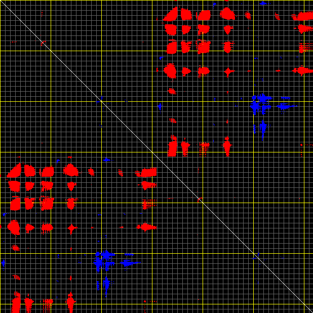 This matrix displays the maximum distance fluctuations between all pairs of CA atoms and between the two extreme conformations that were computed for this mode (DQMIN/DQMAX). Distance increases are plotted in blue and decreases in red for the strongest 10% of the residue pair distance changes. Every pixel corresponds to a single residue. Grey lines are drawn every 10 residues, yellow lines every 100 residues (counting from the upper left corner).
