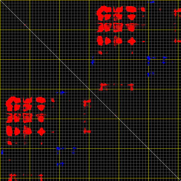 This matrix displays the maximum distance fluctuations between all pairs of CA atoms and between the two extreme conformations that were computed for this mode (DQMIN/DQMAX). Distance increases are plotted in blue and decreases in red for the strongest 10% of the residue pair distance changes. Every pixel corresponds to a single residue. Grey lines are drawn every 10 residues, yellow lines every 100 residues (counting from the upper left corner).