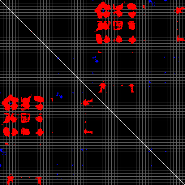 This matrix displays the maximum distance fluctuations between all pairs of CA atoms and between the two extreme conformations that were computed for this mode (DQMIN/DQMAX). Distance increases are plotted in blue and decreases in red for the strongest 10% of the residue pair distance changes. Every pixel corresponds to a single residue. Grey lines are drawn every 10 residues, yellow lines every 100 residues (counting from the upper left corner).