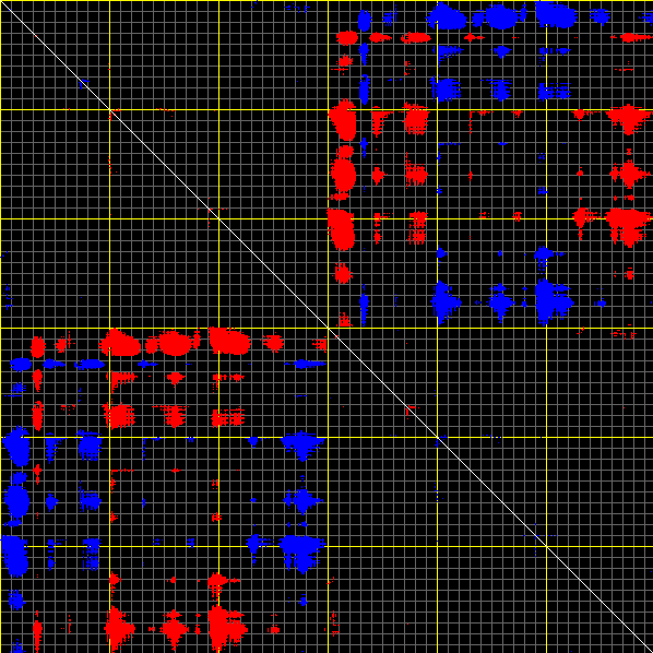 This matrix displays the maximum distance fluctuations between all pairs of CA atoms and between the two extreme conformations that were computed for this mode (DQMIN/DQMAX). Distance increases are plotted in blue and decreases in red for the strongest 10% of the residue pair distance changes. Every pixel corresponds to a single residue. Grey lines are drawn every 10 residues, yellow lines every 100 residues (counting from the upper left corner).