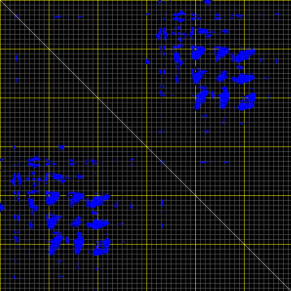 This matrix displays the maximum distance fluctuations between all pairs of CA atoms and between the two extreme conformations that were computed for this mode (DQMIN/DQMAX). Distance increases are plotted in blue and decreases in red for the strongest 10% of the residue pair distance changes. Every pixel corresponds to a single residue. Grey lines are drawn every 10 residues, yellow lines every 100 residues (counting from the upper left corner).