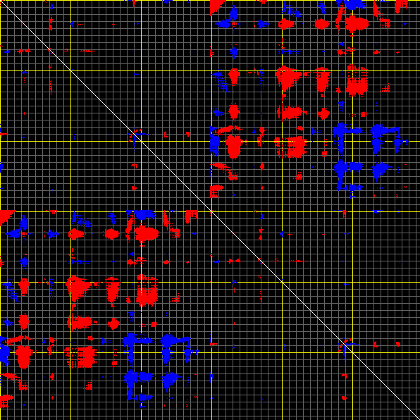 This matrix displays the maximum distance fluctuations between all pairs of CA atoms and between the two extreme conformations that were computed for this mode (DQMIN/DQMAX). Distance increases are plotted in blue and decreases in red for the strongest 10% of the residue pair distance changes. Every pixel corresponds to a single residue. Grey lines are drawn every 10 residues, yellow lines every 100 residues (counting from the upper left corner).