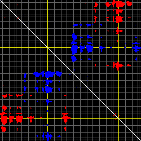 This matrix displays the maximum distance fluctuations between all pairs of CA atoms and between the two extreme conformations that were computed for this mode (DQMIN/DQMAX). Distance increases are plotted in blue and decreases in red for the strongest 10% of the residue pair distance changes. Every pixel corresponds to a single residue. Grey lines are drawn every 10 residues, yellow lines every 100 residues (counting from the upper left corner).