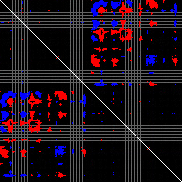 This matrix displays the maximum distance fluctuations between all pairs of CA atoms and between the two extreme conformations that were computed for this mode (DQMIN/DQMAX). Distance increases are plotted in blue and decreases in red for the strongest 10% of the residue pair distance changes. Every pixel corresponds to a single residue. Grey lines are drawn every 10 residues, yellow lines every 100 residues (counting from the upper left corner).