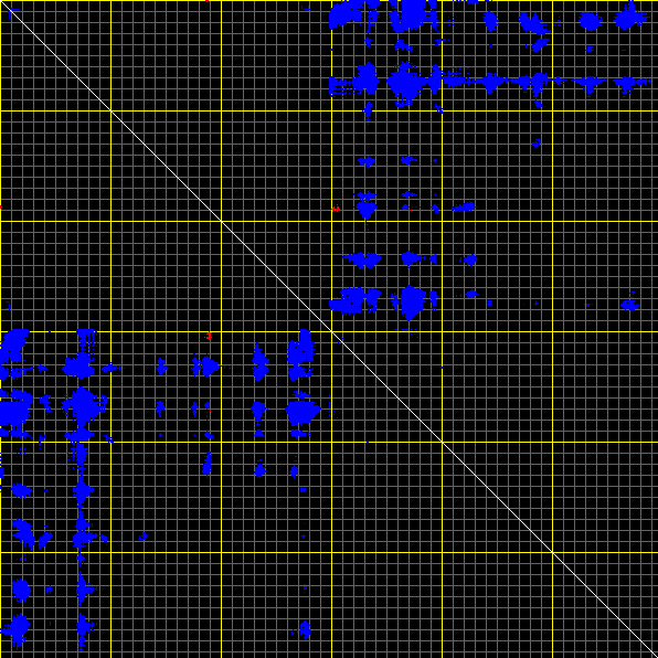 This matrix displays the maximum distance fluctuations between all pairs of CA atoms and between the two extreme conformations that were computed for this mode (DQMIN/DQMAX). Distance increases are plotted in blue and decreases in red for the strongest 10% of the residue pair distance changes. Every pixel corresponds to a single residue. Grey lines are drawn every 10 residues, yellow lines every 100 residues (counting from the upper left corner).