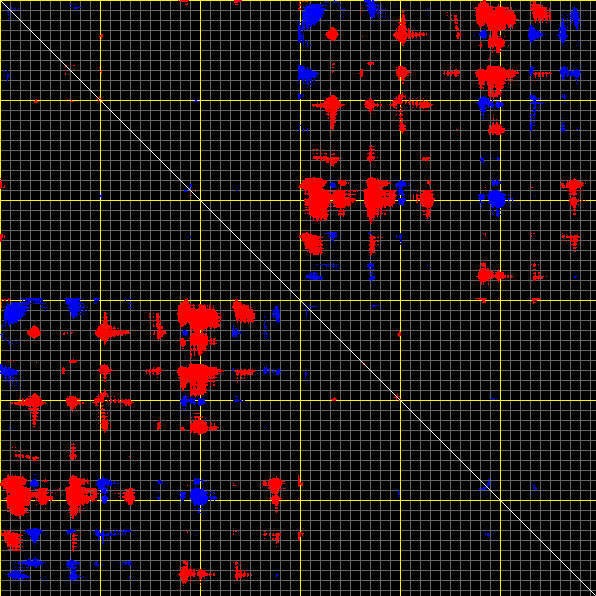 This matrix displays the maximum distance fluctuations between all pairs of CA atoms and between the two extreme conformations that were computed for this mode (DQMIN/DQMAX). Distance increases are plotted in blue and decreases in red for the strongest 10% of the residue pair distance changes. Every pixel corresponds to a single residue. Grey lines are drawn every 10 residues, yellow lines every 100 residues (counting from the upper left corner).