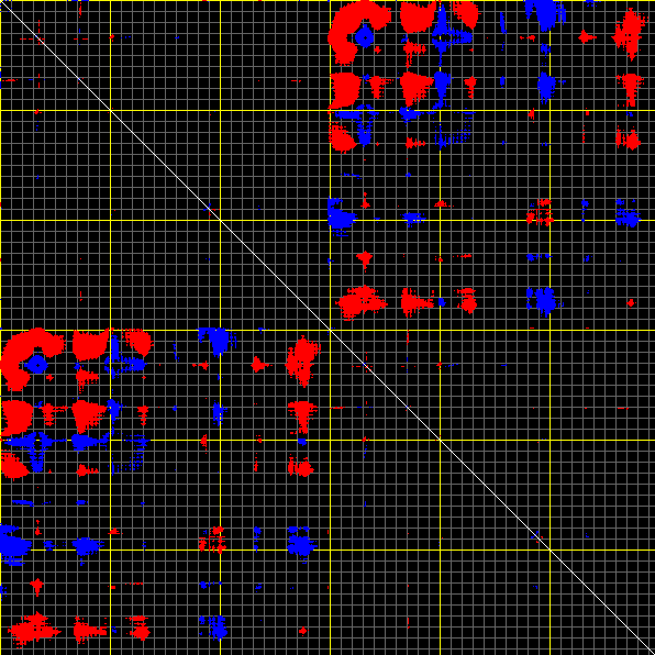 This matrix displays the maximum distance fluctuations between all pairs of CA atoms and between the two extreme conformations that were computed for this mode (DQMIN/DQMAX). Distance increases are plotted in blue and decreases in red for the strongest 10% of the residue pair distance changes. Every pixel corresponds to a single residue. Grey lines are drawn every 10 residues, yellow lines every 100 residues (counting from the upper left corner).