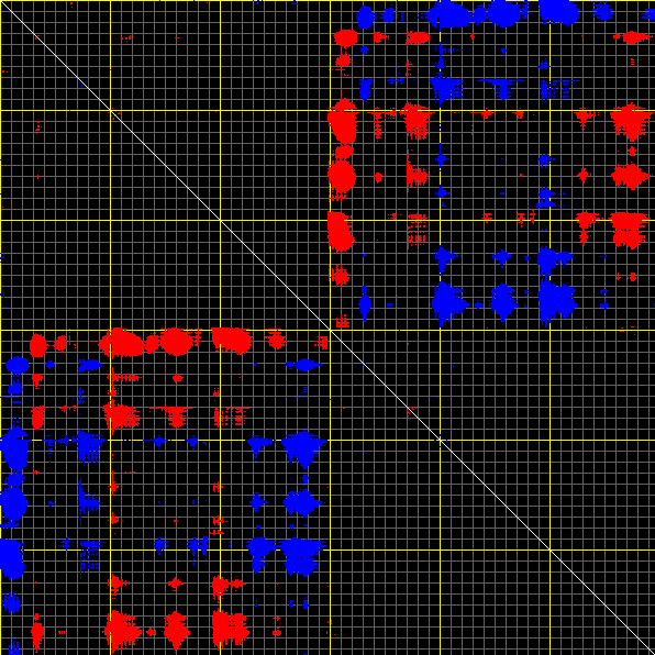 This matrix displays the maximum distance fluctuations between all pairs of CA atoms and between the two extreme conformations that were computed for this mode (DQMIN/DQMAX). Distance increases are plotted in blue and decreases in red for the strongest 10% of the residue pair distance changes. Every pixel corresponds to a single residue. Grey lines are drawn every 10 residues, yellow lines every 100 residues (counting from the upper left corner).