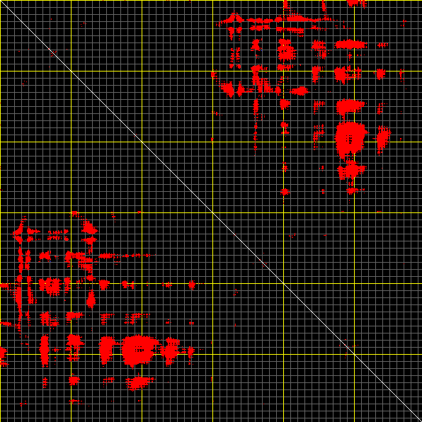 This matrix displays the maximum distance fluctuations between all pairs of CA atoms and between the two extreme conformations that were computed for this mode (DQMIN/DQMAX). Distance increases are plotted in blue and decreases in red for the strongest 10% of the residue pair distance changes. Every pixel corresponds to a single residue. Grey lines are drawn every 10 residues, yellow lines every 100 residues (counting from the upper left corner).