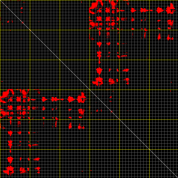 This matrix displays the maximum distance fluctuations between all pairs of CA atoms and between the two extreme conformations that were computed for this mode (DQMIN/DQMAX). Distance increases are plotted in blue and decreases in red for the strongest 10% of the residue pair distance changes. Every pixel corresponds to a single residue. Grey lines are drawn every 10 residues, yellow lines every 100 residues (counting from the upper left corner).