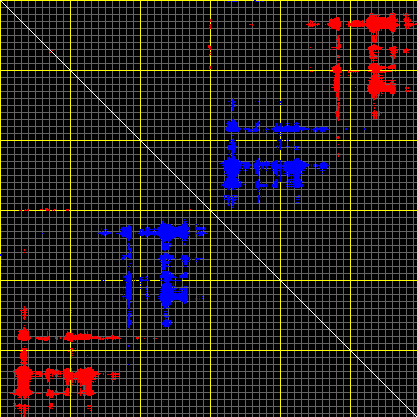 This matrix displays the maximum distance fluctuations between all pairs of CA atoms and between the two extreme conformations that were computed for this mode (DQMIN/DQMAX). Distance increases are plotted in blue and decreases in red for the strongest 10% of the residue pair distance changes. Every pixel corresponds to a single residue. Grey lines are drawn every 10 residues, yellow lines every 100 residues (counting from the upper left corner).