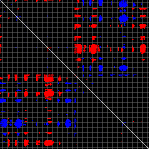 This matrix displays the maximum distance fluctuations between all pairs of CA atoms and between the two extreme conformations that were computed for this mode (DQMIN/DQMAX). Distance increases are plotted in blue and decreases in red for the strongest 10% of the residue pair distance changes. Every pixel corresponds to a single residue. Grey lines are drawn every 10 residues, yellow lines every 100 residues (counting from the upper left corner).