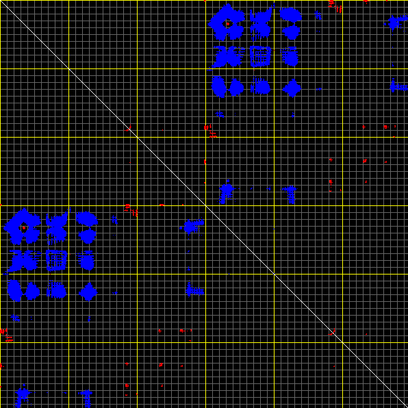 This matrix displays the maximum distance fluctuations between all pairs of CA atoms and between the two extreme conformations that were computed for this mode (DQMIN/DQMAX). Distance increases are plotted in blue and decreases in red for the strongest 10% of the residue pair distance changes. Every pixel corresponds to a single residue. Grey lines are drawn every 10 residues, yellow lines every 100 residues (counting from the upper left corner).