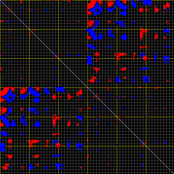 This matrix displays the maximum distance fluctuations between all pairs of CA atoms and between the two extreme conformations that were computed for this mode (DQMIN/DQMAX). Distance increases are plotted in blue and decreases in red for the strongest 10% of the residue pair distance changes. Every pixel corresponds to a single residue. Grey lines are drawn every 10 residues, yellow lines every 100 residues (counting from the upper left corner).