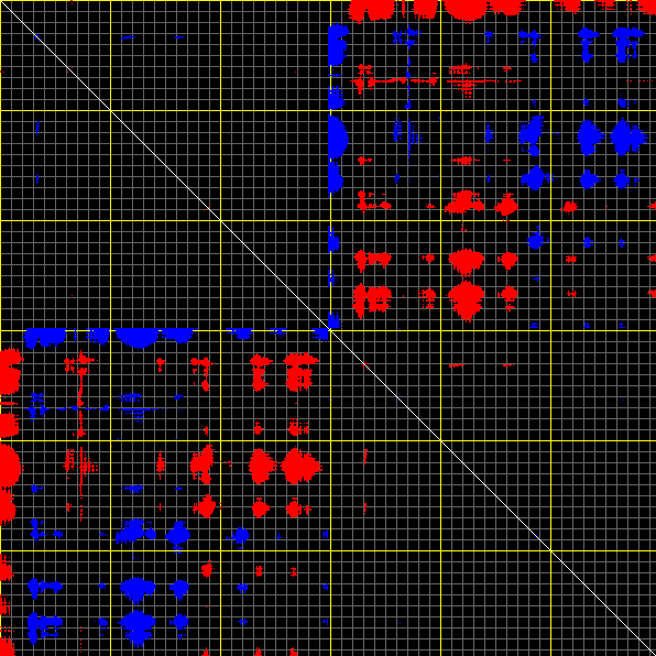 This matrix displays the maximum distance fluctuations between all pairs of CA atoms and between the two extreme conformations that were computed for this mode (DQMIN/DQMAX). Distance increases are plotted in blue and decreases in red for the strongest 10% of the residue pair distance changes. Every pixel corresponds to a single residue. Grey lines are drawn every 10 residues, yellow lines every 100 residues (counting from the upper left corner).