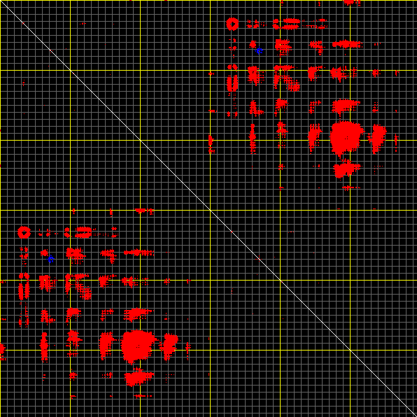 This matrix displays the maximum distance fluctuations between all pairs of CA atoms and between the two extreme conformations that were computed for this mode (DQMIN/DQMAX). Distance increases are plotted in blue and decreases in red for the strongest 10% of the residue pair distance changes. Every pixel corresponds to a single residue. Grey lines are drawn every 10 residues, yellow lines every 100 residues (counting from the upper left corner).