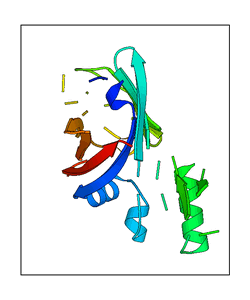 These views are prepared from three orthologuous viewpoints with MolScript. Secondary structures are determined from the C-alpha atom positions of your protein (N-terminal blue, C-terminal red).