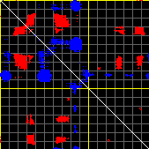This matrix displays the maximum distance fluctuations between all pairs of CA atoms and between the two extreme conformations that were computed for this mode (DQMIN/DQMAX). Distance increases are plotted in blue and decreases in red for the strongest 10% of the residue pair distance changes. Every pixel corresponds to a single residue. Grey lines are drawn every 10 residues, yellow lines every 100 residues (counting from the upper left corner).