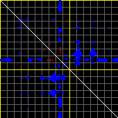This matrix displays the maximum distance fluctuations between all pairs of CA atoms and between the two extreme conformations that were computed for this mode (DQMIN/DQMAX). Distance increases are plotted in blue and decreases in red for the strongest 10% of the residue pair distance changes. Every pixel corresponds to a single residue. Grey lines are drawn every 10 residues, yellow lines every 100 residues (counting from the upper left corner).