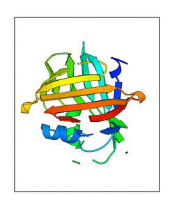 These views are prepared from three orthologuous viewpoints with MolScript. Secondary structures are determined from the C-alpha atom positions of your protein (N-terminal blue, C-terminal red).