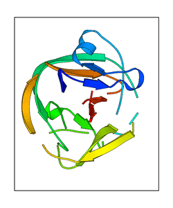These views are prepared from three orthologuous viewpoints with MolScript. Secondary structures are determined from the C-alpha atom positions of your protein (N-terminal blue, C-terminal red).