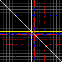 This matrix displays the maximum distance fluctuations between all pairs of CA atoms and between the two extreme conformations that were computed for this mode (DQMIN/DQMAX). Distance increases are plotted in blue and decreases in red for the strongest 10% of the residue pair distance changes. Every pixel corresponds to a single residue. Grey lines are drawn every 10 residues, yellow lines every 100 residues (counting from the upper left corner).