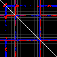 This matrix displays the maximum distance fluctuations between all pairs of CA atoms and between the two extreme conformations that were computed for this mode (DQMIN/DQMAX). Distance increases are plotted in blue and decreases in red for the strongest 10% of the residue pair distance changes. Every pixel corresponds to a single residue. Grey lines are drawn every 10 residues, yellow lines every 100 residues (counting from the upper left corner).