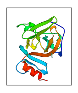 These views are prepared from three orthologuous viewpoints with MolScript. Secondary structures are determined from the C-alpha atom positions of your protein (N-terminal blue, C-terminal red).