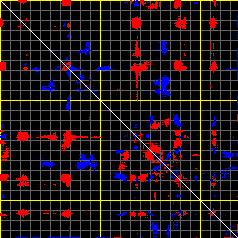 This matrix displays the maximum distance fluctuations between all pairs of CA atoms and between the two extreme conformations that were computed for this mode (DQMIN/DQMAX). Distance increases are plotted in blue and decreases in red for the strongest 10% of the residue pair distance changes. Every pixel corresponds to a single residue. Grey lines are drawn every 10 residues, yellow lines every 100 residues (counting from the upper left corner).