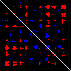 This matrix displays the maximum distance fluctuations between all pairs of CA atoms and between the two extreme conformations that were computed for this mode (DQMIN/DQMAX). Distance increases are plotted in blue and decreases in red for the strongest 10% of the residue pair distance changes. Every pixel corresponds to a single residue. Grey lines are drawn every 10 residues, yellow lines every 100 residues (counting from the upper left corner).