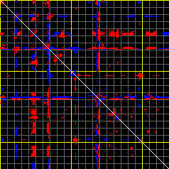 This matrix displays the maximum distance fluctuations between all pairs of CA atoms and between the two extreme conformations that were computed for this mode (DQMIN/DQMAX). Distance increases are plotted in blue and decreases in red for the strongest 10% of the residue pair distance changes. Every pixel corresponds to a single residue. Grey lines are drawn every 10 residues, yellow lines every 100 residues (counting from the upper left corner).