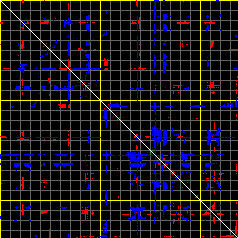 This matrix displays the maximum distance fluctuations between all pairs of CA atoms and between the two extreme conformations that were computed for this mode (DQMIN/DQMAX). Distance increases are plotted in blue and decreases in red for the strongest 10% of the residue pair distance changes. Every pixel corresponds to a single residue. Grey lines are drawn every 10 residues, yellow lines every 100 residues (counting from the upper left corner).