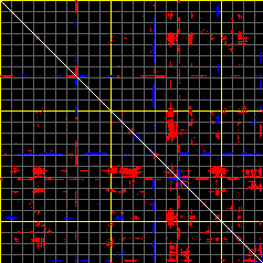 This matrix displays the maximum distance fluctuations between all pairs of CA atoms and between the two extreme conformations that were computed for this mode (DQMIN/DQMAX). Distance increases are plotted in blue and decreases in red for the strongest 10% of the residue pair distance changes. Every pixel corresponds to a single residue. Grey lines are drawn every 10 residues, yellow lines every 100 residues (counting from the upper left corner).