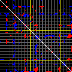 This matrix displays the maximum distance fluctuations between all pairs of CA atoms and between the two extreme conformations that were computed for this mode (DQMIN/DQMAX). Distance increases are plotted in blue and decreases in red for the strongest 10% of the residue pair distance changes. Every pixel corresponds to a single residue. Grey lines are drawn every 10 residues, yellow lines every 100 residues (counting from the upper left corner).