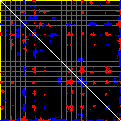 This matrix displays the maximum distance fluctuations between all pairs of CA atoms and between the two extreme conformations that were computed for this mode (DQMIN/DQMAX). Distance increases are plotted in blue and decreases in red for the strongest 10% of the residue pair distance changes. Every pixel corresponds to a single residue. Grey lines are drawn every 10 residues, yellow lines every 100 residues (counting from the upper left corner).