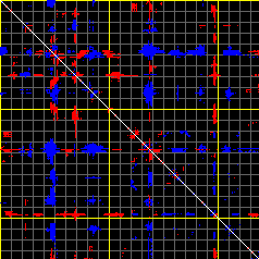 This matrix displays the maximum distance fluctuations between all pairs of CA atoms and between the two extreme conformations that were computed for this mode (DQMIN/DQMAX). Distance increases are plotted in blue and decreases in red for the strongest 10% of the residue pair distance changes. Every pixel corresponds to a single residue. Grey lines are drawn every 10 residues, yellow lines every 100 residues (counting from the upper left corner).